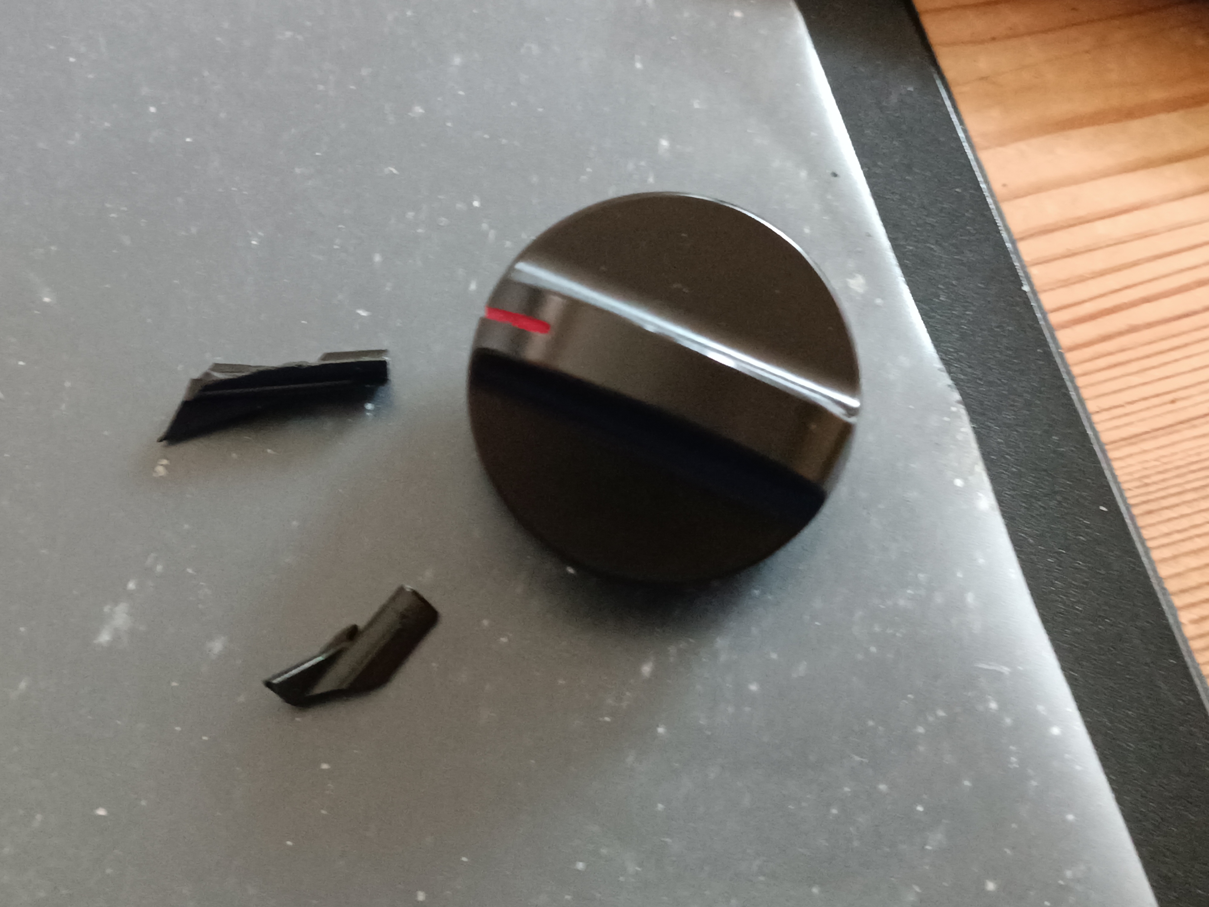 Irgendwann gibt bestimmt jedes Plastik den Geist auf. Mit dem 3d-Drucker kann dann passender Ersatz produziert werden und das Gerät kann weiter verwendet werden. Ein Standard-Ersatzknopf wie der untere im Bild mit der Messingschraube passte hier nicht, da der Zeitwahlknopf der Mikrowelle noch einen Anschlag benötigt, da sich der Knopf während des Betriebes automatisch zurückdreht.